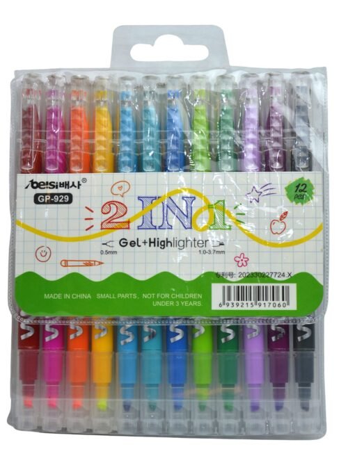 طقم اقلام جل + هايلايتر 12 لون 2*1 سن رفيع