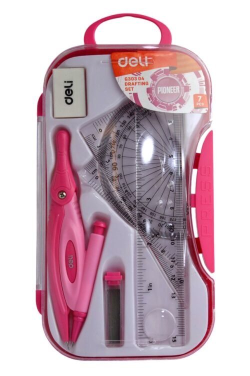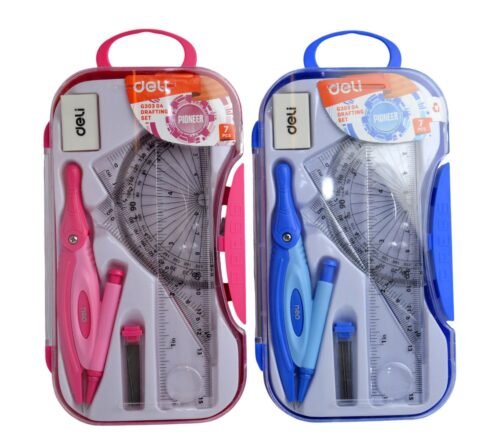طقم ادوات هندسية قلم سنون ديلي فرجار براس مريح للاستخدام ويصل قطر الدائرة حتي 180مم مادة متينة العلبة الهندسية تحتوي فرجار مع مرسم ميكانيكي علبة سنون ممحاة مسطرة 15سم مثلث زاوية 30وطول 10سم مثلث زاوية 45 وطول 7سم منقلة